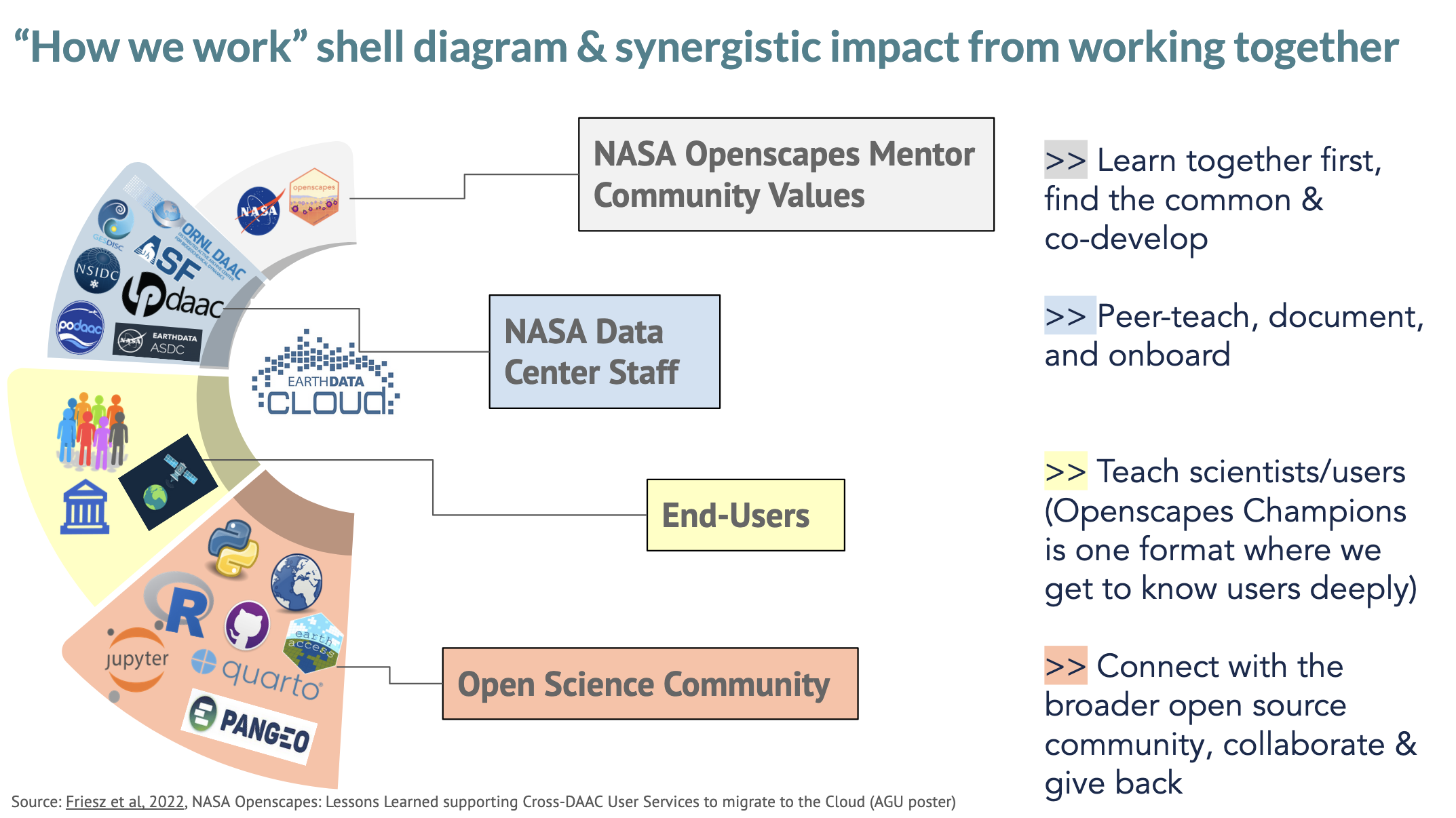 Openscapes is about working effectively and openly as teams. We are user-focused and meet regularly to learn skills of immediate use together and to work on common needs for researchers using NASA Earthdata. We have an open science approach to resource development, where we focus on having space and place, sharing early and iterating with feedback, with a “make once, use often”, future us web-first mindset. Mentors build skills through Openscapes mentorship, co-developing events, software, and open practices and relationships with the open source community, with access to a JupyterHub that helps refine teaching strategies for Cloud.